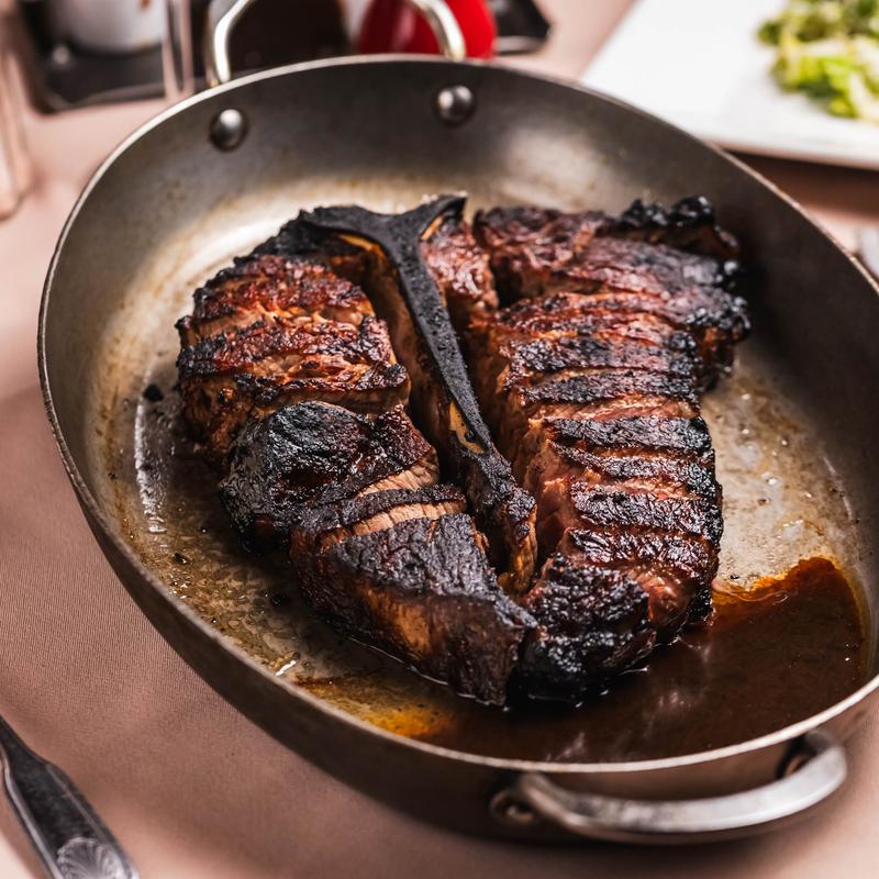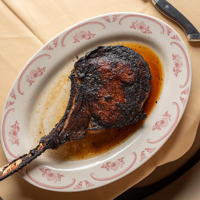 35-day dry-aged, double long bone rib chop, charred and sliced off the bone.