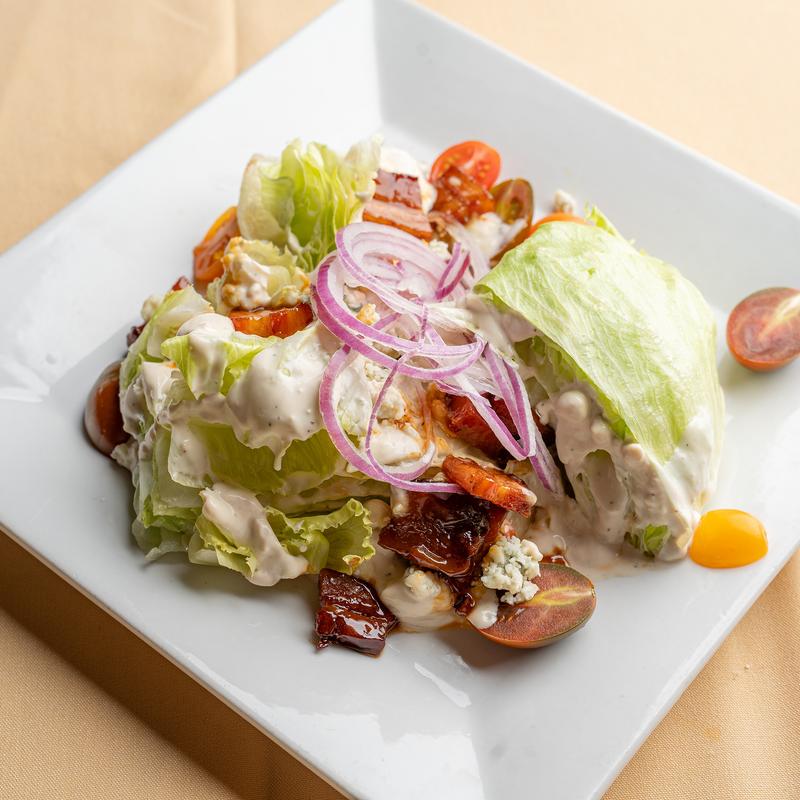 Red onions, bacon, tomatoes, stilton blue cheese crumbles, and blue cheese dressing.