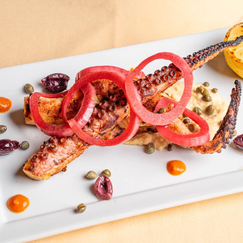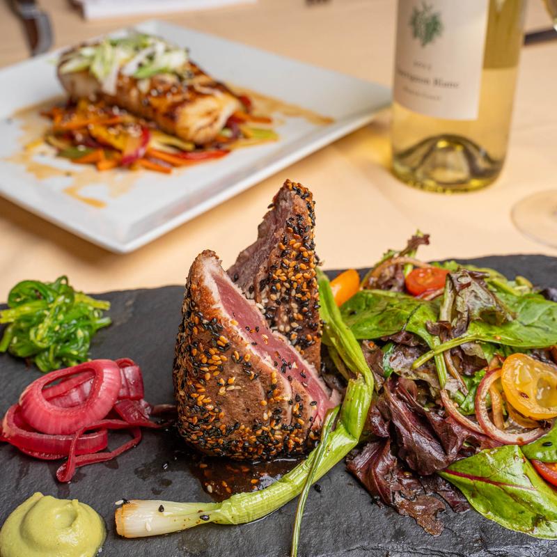 Sesame crusted, mixed green seaweed salad, scallions, pickled red onions, asian dressing, wasabi.