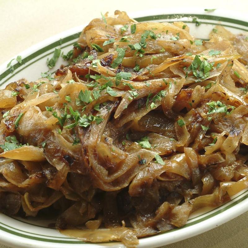 Herb-crusted shaved prime rib steak, Grande mozzarella, French onion soup, fries.